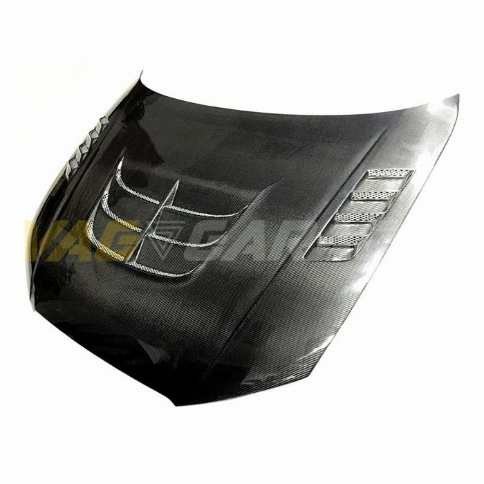 Crafted from premium 2x2 twill weave carbon fibre, this bonnet is significantly lighter than the OEM panel while retaining strength and rigidity. The high-gloss, UV-protected clear coat keeps the carbon weave looking flawless for years.