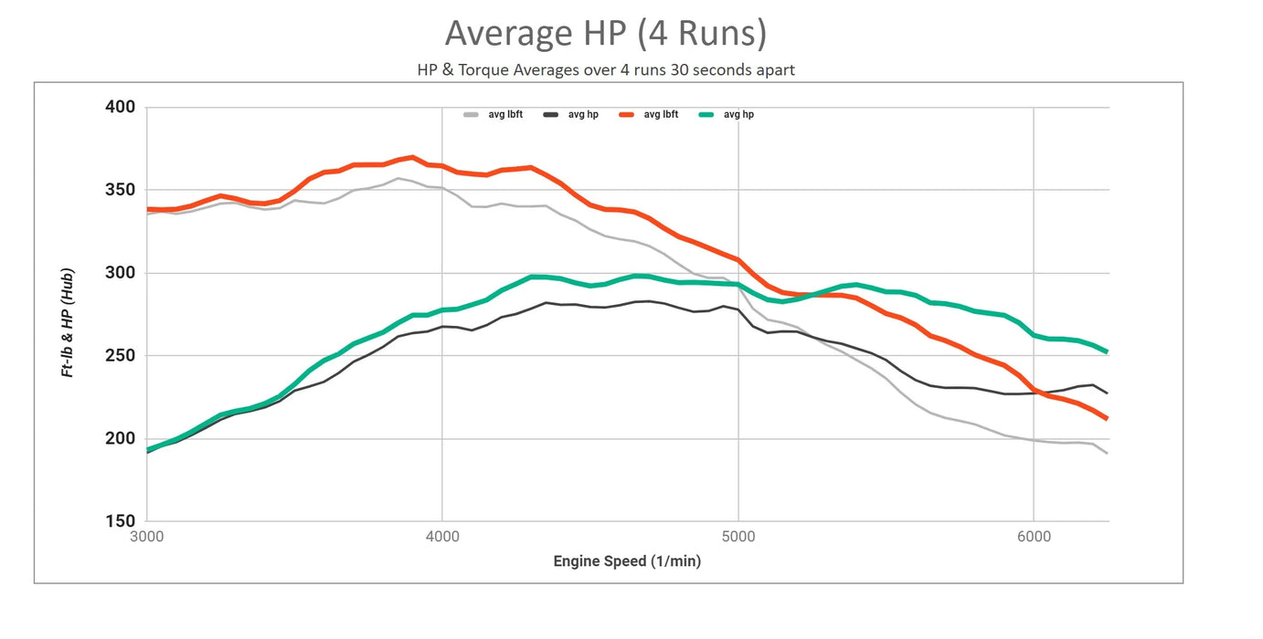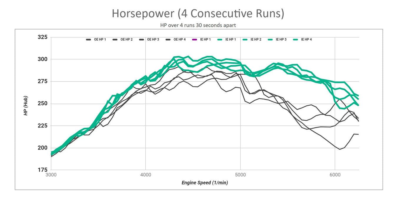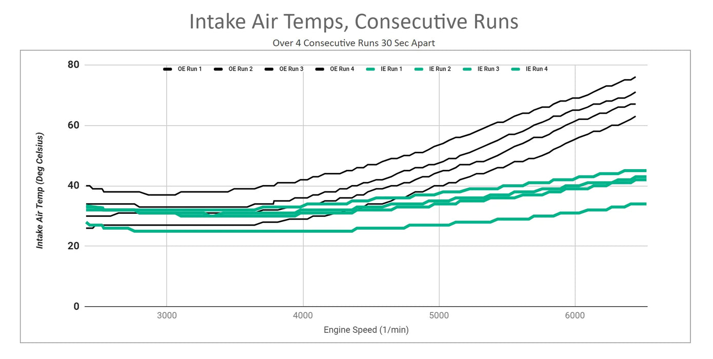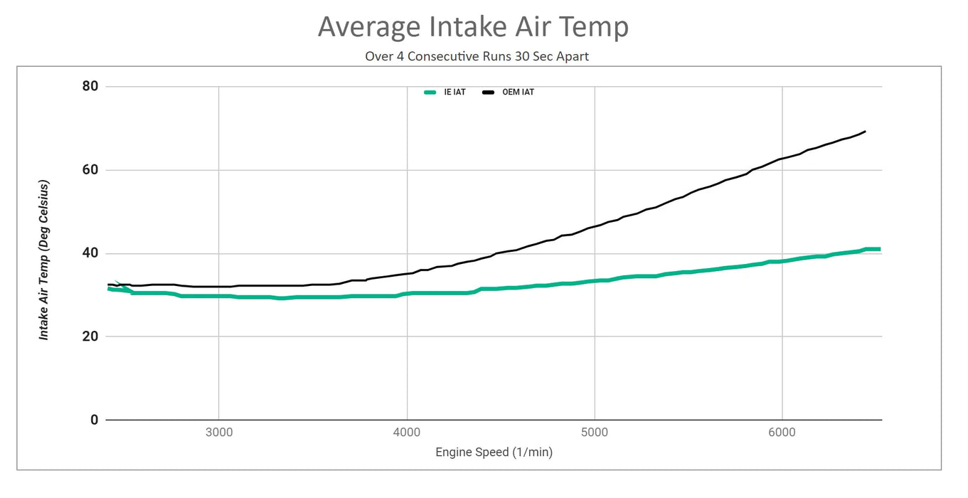 Our unique IE FDS Intercooler design for the Audi B9 platform consistently results in an IAT drop of approximately 20C-30C average at the end of open throttle pulls compared to the factory intercooler.