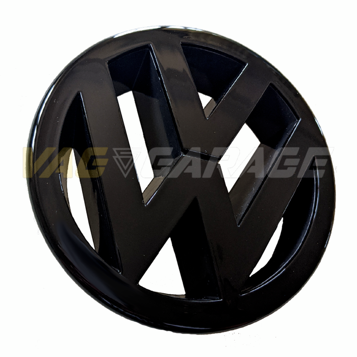 High-end clip-on style aftermarket VW Gloss Black badge set with clips and housing.