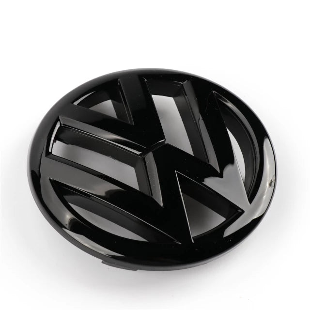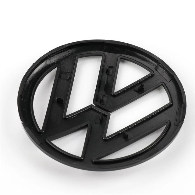 High-end clip-on style aftermarket VW Gloss Black badge set with clips and housing.